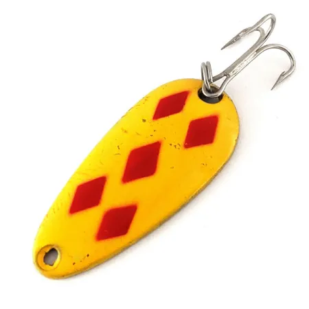 Vijf duidelijke rode ruiten vallen op tegen het heldergele emaille van dit Canadese kunstaas. Met een afmeting van 4 cm (1 1/2") en een gewicht van 7 g (1/4 oz) is maat #8 een vaste waarde voor sportvissers die op diverse zoetwatersoorten vissen via werpen of trollen. De achterzijde toont een zuivere messing afwerking met de duidelijk zichtbare stempel "LEN THOMPSON NO. 8", een kenmerk van het erfgoed dat in 1929 begon. Dit exemplaar met productcode 12340 verkeert in 5/5 staat, met een glad oppervlak en scherpe verflijnen. De lepel is uitgerust met een zilverkleurige dreg en een splitring. Deze messing lepels staan historisch bekend om hun langzame, wiebelende actie. Het voorste oogje is schoon, wat een gemakkelijke bevestiging aan een speld of lijn mogelijk maakt.