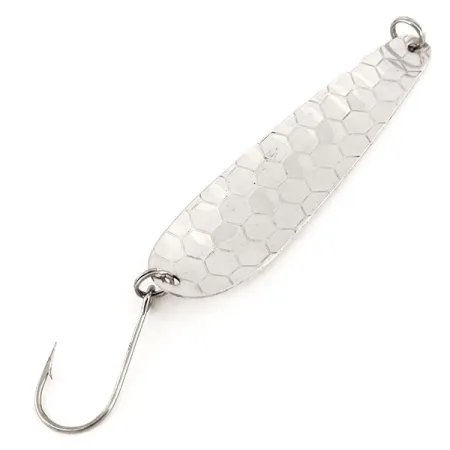 Een klassiek gehamerd zeskantpatroon bedekt het oppervlak van deze verzilverde messing lepel, een ontwerp bedoeld om de lichtreflectie te maximaliseren voor het trollen in diep water. Met een gewicht van 14 g (1/2 oz) en een lengte van 9,5 cm (3 3/4"), is deze Len Thompson Northern King NK28 een goed bewaard gebleven exemplaar, herkenbaar aan productcode 12691. Het kunstaas verkeert in 5/5 conditie en toont de heldere en schone afwerking die kenmerkend is voor de echte verzilvering die deze Canadese fabrikant gebruikt sinds de serie in 1984 werd geïntroduceerd. Dit specifieke model staat onder sportvissers bekend om zijn langzaam waggelende actie, die bijzonder effectief is bij het vissen op meerforel, zalm en steelhead. Aan de holle binnenzijde bij de staart is de "NK 28" stempel nog steeds scherp en duidelijk leesbaar. De montage bestaat uit een enkele grote haak die is bevestigd met een heavy-duty splitring, met een bijbehorend bevestigingspunt aan de kop voor uw lijn of wartel.