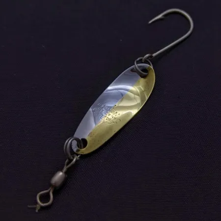 Vernikkelde en gouden afwerkingen komen samen in een kenmerkend tweekleurig ontwerp op deze 3,5 cm lepel, een klassieker uit de Les Davis-lijn. Dit kunstaas, bekend onder productcode 24021, is voorzien van duidelijke inscripties van de naam 'Canadian Wonder' en de fabrikant op de gepolijste zijde. Met een gewicht van 2,5 g is het lichaam gevormd als een smalle druppel, bedoeld voor het werpen met lichte lijnen of voor slepend vissen. Een enkele haak is aan de achterzijde bevestigd met een donkere splitring, terwijl een bijpassende tonwartel aan de voorzijde kinken in de lijn helpt voorkomen tijdens het gebruik. Dit in de VS gemaakte verzamelobject verkeert in topstaat (beoordeling 5/5), waarbij de reflecterende coating geen sporen van slijtage vertoont. Het contrast tussen het glanzende nikkel en de warme goudtint accentueert de originele fabrieksafwerking.