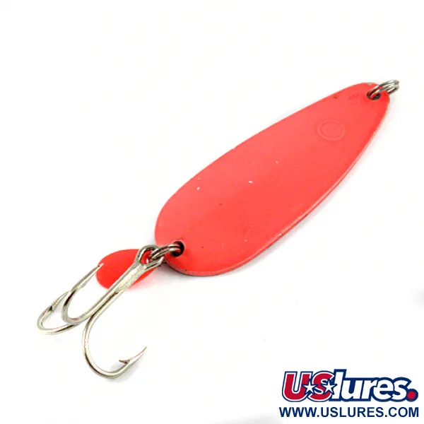 Het "HOTROD"-merk is duidelijk gestempeld in de vernikkelde achterzijde, wat deze lepel van 32g (1 1/4 oz) identificeert als een robuuste Luhr Jensen-productie. Met een lengte van 9cm (3 1/2") is het kunstaas afgewerkt met een levendige fluorescerend roze voorkant die contrasteert met de gepolijste nikkelen achterkant voor een veelzijdig visueel profiel. Een kleine rode plastic attractor is bevestigd aan de achterste splitring naast de dreg om een secundair visueel aantrekkingspunt te bieden. Dit vintage in de USA gemaakte exemplaar, vermeld onder productcode 2896, verkeert in 4/5 conditie, waarbij de afwerking en het beslag scherp en goed gedefinieerd zijn gebleven. Het is specifiek ontworpen voor zware werp- en troll-toepassingen waarbij het gewicht en profiel nodig zijn om diepe waterzones te bereiken.