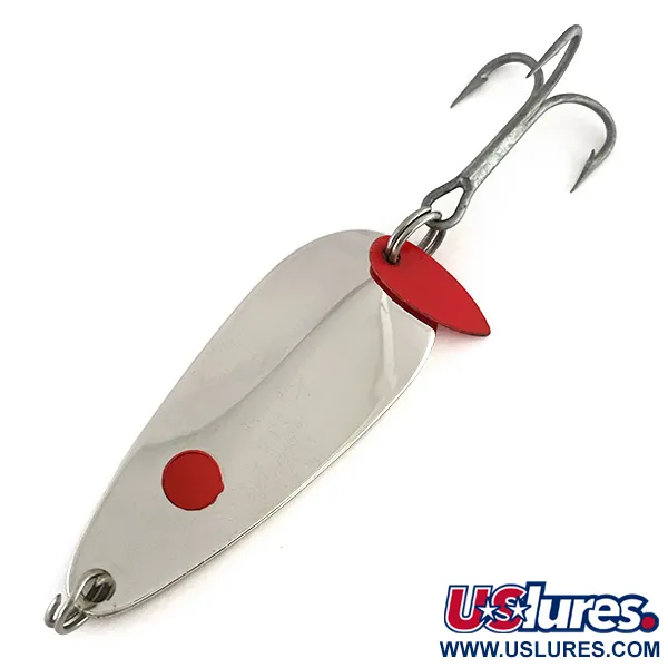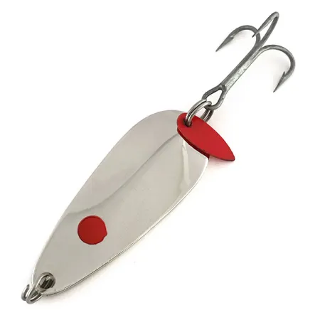 Op de holle kant van het blad zijn de namen Les Davis en Hotrod duidelijk ingestempeld, wat dit model 8254 markeert als een klassieker uit de visgeschiedenis van de Pacific Northwest. De hoogglanzende nikkelafwerking wordt geaccentueerd door een enkele rode stip op de voorzijde en een kenmerkende rode plastic flipper aan de achterste splitring naast de dreg. Met een gewicht van 1/2 oz (14 g) en een lengte van 2 1/4" (5,5 cm) is het kunstaas gebouwd op een massief koperen basis, een kenmerk van de kwaliteitsproductie in de Luhr Jensen-fabriek in de VS. Dit exemplaar verkeert in uitstekende staat (5/5), met een reflecterend oppervlak en schoon, scherp beslag. De tekst "Hotrod" is helder en leesbaar, zonder tekenen van slijtage die vaak voorkomen bij vintage trolllepels.