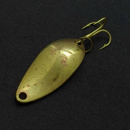 Met een gewicht van 4,5g (3/16oz) is deze compacte metalen lepel de 'stubby' variant van het klassieke Krocodile-ontwerp van Luhr Jensen. Deze Lil' Kroc, voorzien van artikelcode 24208, heeft een massief messing afwerking met lichte oppervlakkige markeringen en verkeert in een goed bewaarde staat van 4/5. De body meet 3,2 cm (1 1/4") en is uitgerust met een goudkleurige dreg die met een splitring is bevestigd. Dit specifieke model is geproduceerd in de VS en is een erkende zeldzaamheid onder liefhebbers van vintage kunstaas, herkenbaar aan het kortere en bredere profiel in vergelijking met standaard lepels. Een enkel oogje aan het smalle uiteinde dient voor de lijnbevestiging, en er zijn kleine krasjes en lichte vlekjes zichtbaar op het messing oppervlak.