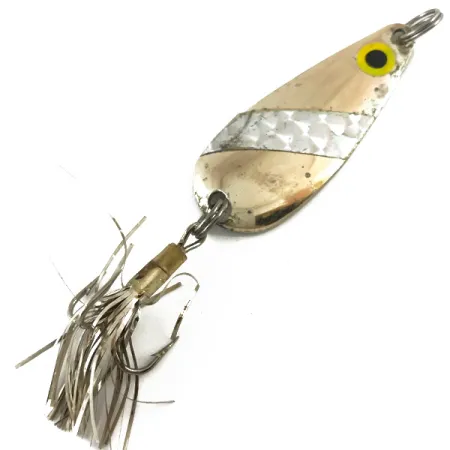 Een verzilverde laag over het 5,5 cm (2 1/4") lange lichaam zorgt voor de basisflits van deze Lindy Finsel lepel van Joe's Flies. De modelnaam is duidelijk op de achterzijde van het blad gestanst, wat de herkomst als klassiek stuk Amerikaans hengelsportmateriaal bevestigt. Een getextureerde reflecterende tape met diamantpatroon deelt het verzilverde oppervlak in tweeën, terwijl een geschilderd geel oog met een zwarte pupil vlakbij de bovenste splitring zit. Met een gewicht van 10 g (1/3 oz) is het kunstaas uitgerust met een haak voorzien van een glinsterende zilveren tinsel skirt. Met productcode 4497 is dit exemplaar in een 4/5 conditie, waarbij de metalen afwerking schoon en goed bewaard is gebleven. Kleine oppervlakkige markeringen op de verzilvering weerspiegelen het vintage karakter zonder de structurele integriteit aan te tasten.