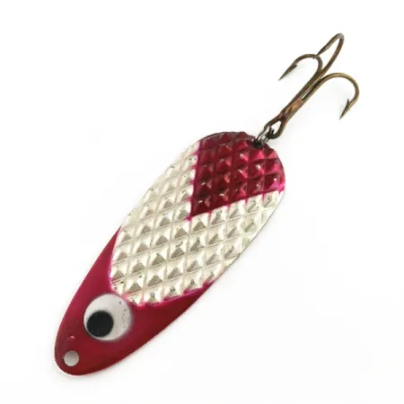 Een vernikkelde afwerking met diamanttextuur vormt de basis van deze 55g (2 oz) Lindy Gator lepel. Met een lengte van 11,5 cm (4 1/2") is dit kunstaas voorzien van een opvallende rood-witte laklaag over een gestanst schubbenpatroon. Een dieprode chevron accentueert de kop, terwijl de rest van de body overgaat in een wit middenstuk met rode flanken aan de onderzijde. Geproduceerd in de VS door Lindy / Little Joe, draagt dit exemplaar productcode 23586 en is voorzien van een extra groot 'googly' oog voor extra visueel contrast bij het bevestigingsoog. De montage bestaat uit een stevige dreg die met een splitring aan de achterzijde is bevestigd. Met een conditiescore van 4/5 toont de lepel overal heldere metalen oppervlakken en levendige kleuren.