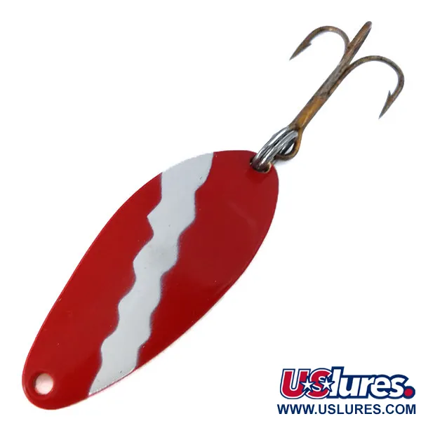 Met een gewicht van 1/4 oz (7 g) vertegenwoordigt deze klassieke werplepel de originele productieperiode van Seneca Lure voordat het merk begin jaren 80 werd overgenomen door Acme. De voorkant is afgewerkt met een rood en wit golvend patroon met hoog contrast, een kenmerkend ontwerp voor zichtbaarheid onder verschillende lichtomstandigheden. Aan de achterzijde is het messingkleurige metaal diep gestempeld met het merkmerk "LITTLE CLEO WIGL LURE SENECA LURE", wat de Amerikaanse productieroots bevestigt onder productcode 10813. Met een lengte van 1 1/2" (4 cm) is het lichaam gekoppeld aan een verweerde dreg die is bevestigd via een robuuste splitring. Gezien de conditiescore van 4/5 is het kunstaas goed bewaard gebleven, met slechts minimale tekenen van ouderdom terwijl de gestempelde letters scherp zijn en het geverfde oppervlak intact is. Dit exemplaar vangt de specifieke materiaalkwaliteit en stempeldiepte die kenmerkend zijn voor de originele output van de Seneca-fabriek.
