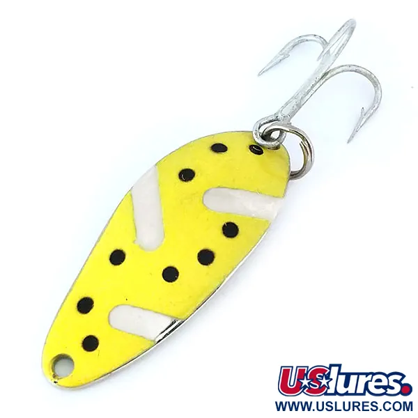Een levendige gele emaille afwerking met gedurfde zwarte stippen kenmerkt deze Little Cleo, een klassieke Amerikaanse lepel van 1/4 oz (7 g). Met een lengte van 1 1/2" (4 cm) toont het kunstaas een kenmerkend pre-Acme erfgoed met de 'SENECA LURE' en 'WIGL-LURE' stempels diep gedrukt in de gepolijste nikkelen achterkant. Dit specifieke exemplaar, gecatalogiseerd onder productcode 11018, heeft een opvallend patroon van zwarte stippen op een geel veld, doorsneden door gebogen witte strepen die visueel contrast toevoegen aan het metalen lichaam. De hardware bestaat uit een robuuste dreg die met de lepel is verbonden door een stevige stalen splitring. De staat is beoordeeld op 5/5, waarbij de lak- en nikkeloppervlakken uitstekend bewaard zijn gebleven uit de oorspronkelijke productieperiode door Seneca in de VS.