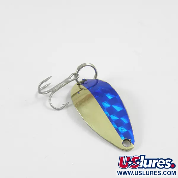 Deze Seneca lepel is 3 cm (1 1/4") lang en heeft een opvallende half-om-half afwerking op de bolle zijde. De ene helft heeft een glanzende vergulde uitstraling, terwijl de andere is bedekt met een levendige blauwe prismatische schubbentape die het licht effectief weerkaatst. Dit specifieke model, productcode 2972, stamt uit het oorspronkelijke Seneca-tijdperk van het ontwerp voordat het merk werd overgenomen door Acme. De achterkant van het kunstaas is gestempeld met de herkenbare naam "LITTLE CLEO", met strakke lijnen en duidelijke belettering. Met een gewicht van 3,5 g (1/8 oz) is de lepel perfect voor precisieworpen op licht materiaal. De hardware bestaat uit een stevige splitring en een glanzende dreg. In 5/5 conditie blijft de afwerking uitzonderlijk schoon op zowel de vergulding als het blauwe prismadetail.