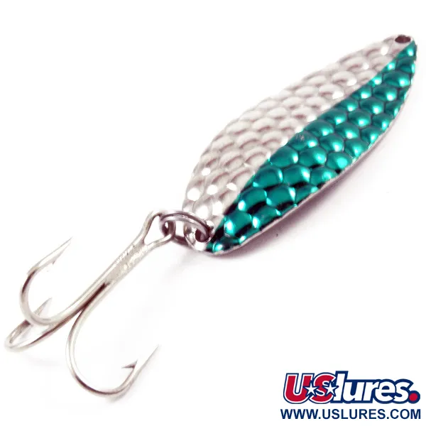 Gehamerde schubben geven textuur aan het oppervlak van deze Nikkel en Groene lepel, waardoor een veelzijdig reflecterend oppervlak ontstaat dat typisch is voor de in de VS gemaakte Little Cleo-serie. Met een gewicht van 21g (3/4oz) en een lengte van 6,5cm (2 1/2"), is het zware metalen lichaam ontworpen voor stabiele worpen en gecontroleerde dieptes. Het gespleten kleurenpatroon verdeelt de voorzijde in een gepolijst nikkel gedeelte en een rijk metallic groen, terwijl de achterzijde een strakke, goed zichtbare nikkelafwerking behoudt. Gelabeld met productcode 3203, behoudt dit exemplaar zijn originele hardware inclusief een scherpe dreg en een sterke splitringverbinding. De 5/5 conditie is duidelijk zichtbaar in de behouden glans van het vernikkelen en de integriteit van de lak. De Acme merksignatuur is duidelijk zichtbaar, wat de oorsprong markeert als een klassiek stuk Amerikaanse hengelsportgeschiedenis.