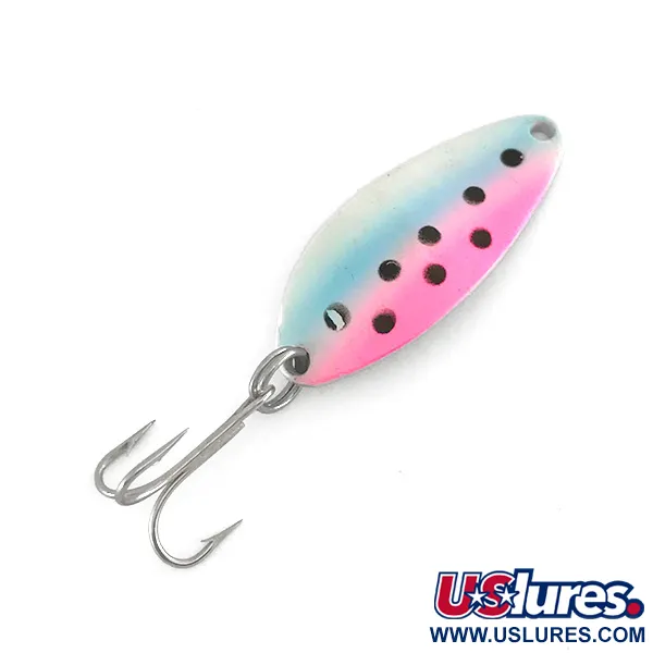 Een gewicht van 7g (1/4 oz) zorgt voor de nodige dichtheid waardoor deze lepel bij het werpen snel de doeldiepte bereikt. Het Trout-kleurenschema is uitgevoerd in een drietraps overgang van wit naar blauw naar roze, geaccentueerd door een reeks zwarte stippen op het bredere deel van de body. Gestanst in de gepolijste nikkelen achterzijde, bevestigt de tekst "Little Cleo Wigl-Lure A Seneca Lure" dat dit item, vermeld onder productcode 7937, werd vervaardigd door de firma Seneca in de VS voorafgaand aan de overname door Acme begin jaren tachtig. De lepel is 4 cm (1 1/2") lang en voorzien van een strak gestanst lijnoog en een achteraan gemonteerde dreg. Met een conditiescore van 5/5 vertoont het kunstaas zeer weinig tekenen van ouderdom, waarbij de helderheid van het geschilderde forelpatroon en de glans van de metalen afwerking behouden zijn gebleven. De splitringen zijn nog strak en functioneel voor direct gebruik of presentatie.