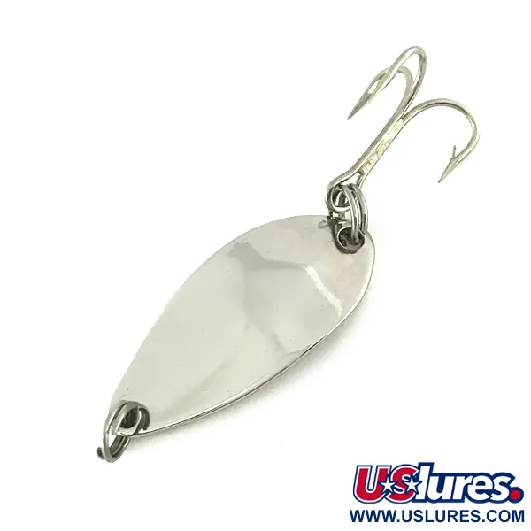 De vernikkeling zorgt voor een glanzende, reflecterende afwerking op deze vintage lepel, waardoor het een opvallend stuk is voor elke collectie visgerei. Met een gewicht van 1/8oz (4g) en een lengte van 1 1/4" (3cm), is dit exemplaar een klassiek voorbeeld van Amerikaanse kunstaasproductie uit het Seneca Lure-tijdperk. Voordat Acme de productie begin jaren tachtig overnam, produceerde Seneca dit kunstaas in de VS met een diepgebold druppelprofiel en een duidelijke stempeling. De holle zijde is duidelijk gestempeld met de naam 'LITTLE CLEO', en het beslag is nog intact met originele splitringen en een schone dreg. Dit kunstaas verkeert in 5/5 conditie, wat de behouden kwaliteit van het metaal en de precisie van de vroege fabricage aantoont. Dit specifieke model staat vermeld onder productcode 8179.