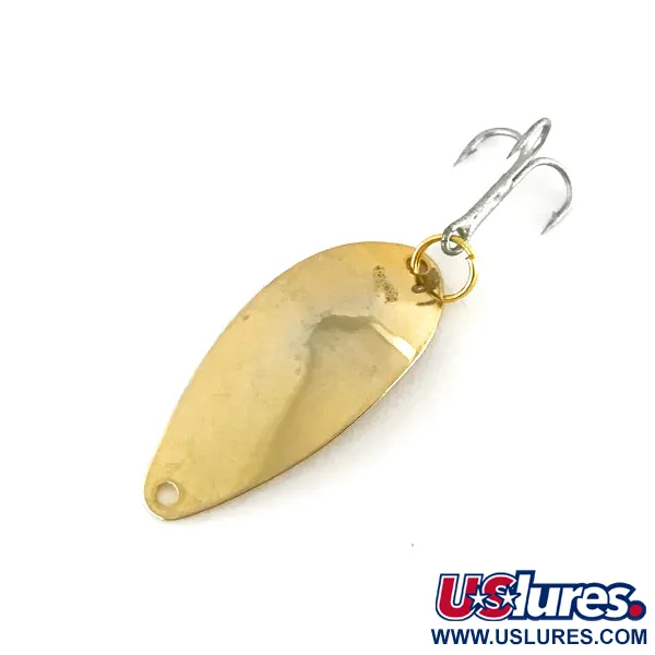 Een gepolijste gouden afwerking bedekt de gehele 3 cm (1 1/4") metalen lepel, wat de originele Seneca Lure Co. erfenis uit de VS weerspiegelt. Met een gewicht van slechts 1,8 g (1/16 oz) is deze versie van de Little Cleo het dunnere troll-profiel dat werd geproduceerd vóór de overname van het merk door Acme begin jaren 80. Het metalen oppervlak heeft een scherpe "LITTLE CLEO" stempel op de achterzijde, vergezeld van de naam Seneca, wat verzamelaars helpt bij het dateren van het fabricagejaar. Aan de achterzijde is via een goudkleurige splitring een scherpe, zilverkleurige dreg bevestigd. Dit exemplaar, vermeld onder productcode 8180, heeft een conditiescore van 5/5 met een glanzend, reflecterend oppervlak en geen zichtbare tekenen van slijtage. De druppelvorm en lichte kromming zijn kenmerkend voor het ontwerp dat bedoeld is voor lichte werpvisserij of trollen.