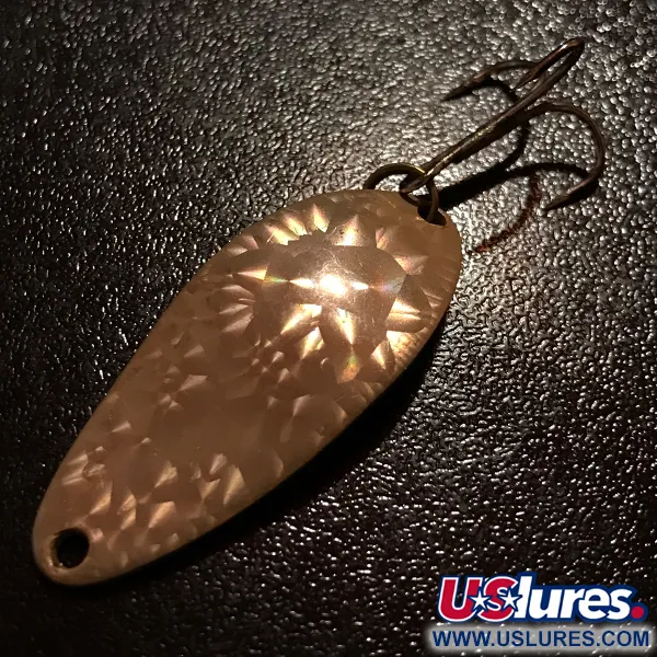 De schubben op deze 4 cm (1 1/2") lepel creëren een lichteffect van «gebroken glas», bekend als de Crystal-afwerking. Gestempeld met de originele «Little Cleo Wiggle-Lure A Seneca Lure»-identificatie, weerspiegelt het metalen lichaam de ontwerpnormen van de Seneca Lure Company van vóór de overname door Acme begin jaren 80. Deze 7 g (1/4 oz) lepel heeft een uitgesproken brede vorm die is afgestemd op het werpen op verschillende dieptes. De goudkleurige afwerking verkeert in perfecte staat, waarbij de integriteit van het gehamerde oppervlak en de leesbare stempeling van de fabrikant behouden zijn gebleven. Dit vintage gereedschap, met productcode 24544, toont de textuur met hoog reliëf die typisch is voor de originele Seneca-productielijn.