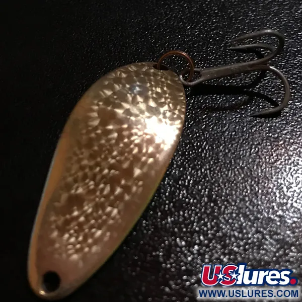 De gefacetteerde oppervlakken op het gehamerde gouden lichaam onderscheiden deze Little Cleo Crystal uit het Seneca-tijdperk, een stukje Amerikaanse hengelsportgeschiedenis geproduceerd voor de overname door Acme begin jaren 80. Met een gewicht van 1/4 oz (7 g) meet de lepel 1 1/2" (4 cm) en draagt de stempel "LITTLE CLEO WIGL-LURE A SENECA LURE" duidelijk op de holle zijde. De kleuraanduiding Crystal verwijst naar de specifieke meerhoekige textuur die is ontworpen om licht te vangen, gecombineerd met een klassieke koperkleurige splitring en een scherpe, originele dreg. Geproduceerd in de USA, draagt dit exemplaar de productcode 8326 en verkeert het in 5/5 conditie. Het zware, gebogen profiel weerspiegelt de originele Seneca-techniek bedoeld voor werpen en trollen, en vertegenwoordigt een specifiek tijdperk van kunstaasproductie voor de overgang van het merk naar Acme.