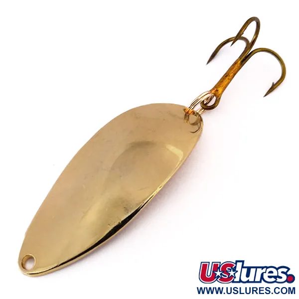 Glinsterend in een klassieke gouden afwerking, markeert een prominente Hula Girl-stempel op de achterzijde dit exemplaar als een zeer verzamelbare vroege productie van de Seneca Lure company. Met een gewicht van 1/2 oz (14 g) meet de lepel 5,5 cm (2 1/4") en draagt deze productcode 10303. Veel ervaren vissers schrijven de legendarische status van de Little Cleo toe aan precies die gravure van de danseres, een detail dat verdween nadat Acme Seneca begin jaren 80 overnam. Het vinden van een exemplaar in ongebruikte staat, beoordeeld met 5/5, is een traktatie voor liefhebbers van de originele "WIGL LURE" branding. Het metaal behoudt zijn oorspronkelijke glans, waardoor de gestempelde afbeeldingen duidelijk afsteken tegen de vergulding. De hardware bestaat uit een bronzen dreg verbonden door een sterke splitring aan de staart.
