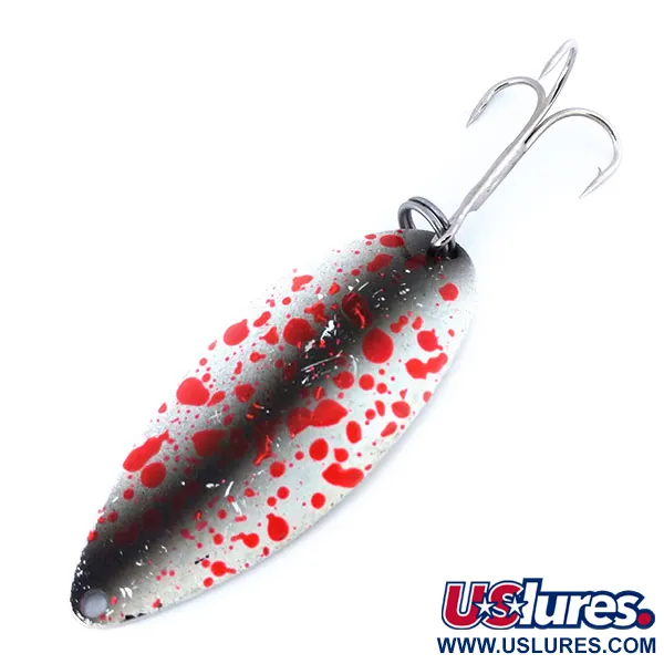 Met een gewicht van 21 g (3/4 oz) toont deze zware werplepel het klassieke Rood/Bruin/Wit/Nikkel spatpatroon dat het merk Seneca al decennialang tot een vaste waarde in tackleboxen maakt. Met een lengte van 6,5 cm (2 1/2") draagt dit Little Cleo (Hula Girl) exemplaar productcode 10778 en vertegenwoordigt het het tijdperk voordat Seneca begin jaren '80 door Acme werd overgenomen. Vissers zoeken vaak naar de gestempelde danseres op de achterkant, een kenmerk dat ontbreekt op moderne versies maar wel aanwezig is op dit vintage stuk. Onder een blacklight onthullen de rode spatelementen een levendige gloed, wat extra zichtbaarheid biedt voor diepere presentaties. De hardware is origineel, met een schone dreg en splitring. Met een conditiescore van 5/5 is de afwerking haarscherp en biedt de nikkelen basis een reflecterend oppervlak met hoog contrast tegen de donkerbruine rug en rode accenten.