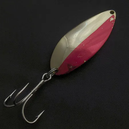 Op de onderzijde van deze lepel van 21g (3/4oz) is de iconische "Hula Girl" danseres duidelijk ingeslagen, een kenmerk van de originele productie door de Seneca Lure Company. Dit specifieke exemplaar, herkenbaar aan productcode 21075, stamt uit het tijdperk voordat Acme Tackle het merk begin jaren 80 overnam, waarna de afbeelding van de danseres uit de productie verdween. Met een lengte van 6,5 cm (2 1/2") is de voorzijde afgewerkt in een tweekleurige goud- en roodroze lak. De geverfde helft vertoont wat authentieke gebruikssporen en lichte lakschade passend bij de leeftijd, hoewel de lepel met een conditiescore van 5/5 in uitstekende staat verkeert. Hij is uitgerust met een sterke dreg met een ruime bocht en een stevige splitring voor een betrouwbare verbinding tijdens het werpen of trollen. De messing body heeft zijn metaalglans behouden en getuigt van het vakmanschap dat deze lepels van Seneca tot een vaste waarde maakte voor sportvissers in de VS.