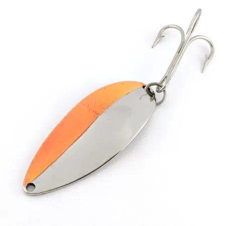 Deze Seneca werplepel valt direct op door de afwerking in nikkel en feloranje, die precies in het midden verdeeld is. Met een lengte van 6,5 cm (2 1/2") en een gewicht van 21 g (3/4 oz), is dit specifieke exemplaar voorzien van de klassieke gestempelde danseres op de achterzijde — een kenmerk van de originele productie van de Seneca Lure company van vóór de overname door Acme in de jaren 80. Veel ervaren verzamelaars geven de voorkeur aan deze 'Hula Girl'-varianten, omdat de gegraveerde afbeelding bij latere productieseries werd weggelaten. Het gepolijste metaal verkeert in uitstekende staat (5/5), zonder noemenswaardige gebruikssporen op de fabrieksafwerking. Op de achterkant van de lepel staan de productcode 22112, het gewicht en de herkomst duidelijk vermeld. Aan de onderkant is een stevige dreg bevestigd, klaar voor het traditionele werpen of trollen.