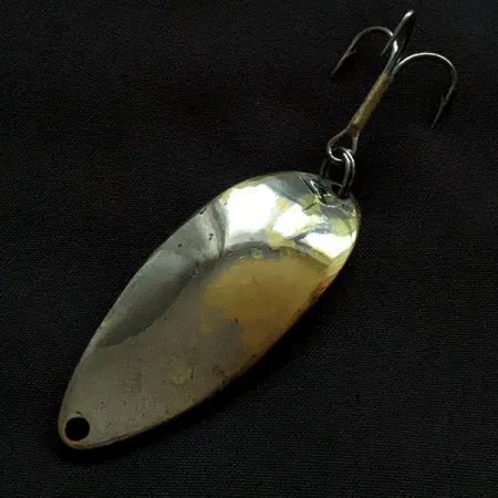 Een opvallende tweekleurige afwerking van nikkel en messing kenmerkt deze klassieke lepel, een eigenschap die samengaat met zijn aanzienlijke gewicht van 18g (2/3oz). Met een lengte van 5,5 cm (2 1/4") is dit specifieke exemplaar, geregistreerd onder productcode 22214, een authentiek stukje hengelsportgeschiedenis van de Seneca Lure Company. Het dateert uit het tijdperk voordat het merk begin jaren 80 door Acme werd overgenomen. Verzamelaars geven de voorkeur aan de "Hula Girl"-variant vanwege de iconische danseres die op de achterzijde is gegraveerd—een detail dat bij moderne producties ontbreekt. Veel ervaren sportvissers zweren er nog steeds bij dat deze kleine gravure het geheim was achter het legendarische succes van dit kunstaas op het water. Het beslag is nog steeds functioneel, voorzien van een stevige dreg die met een robuuste splitring is bevestigd. Met een conditie van 3/5 vertoont de body eerlijke gebruikssporen van een lang leven, waarbij de tweekleurige metaallaag nog steeds effectief het licht vangt. Deze in de VS gemaakte werplepel vertegenwoordigt het originele ontwerp van een kunstaas dat nog steeds onmisbaar is voor forel- en zalmvissers.