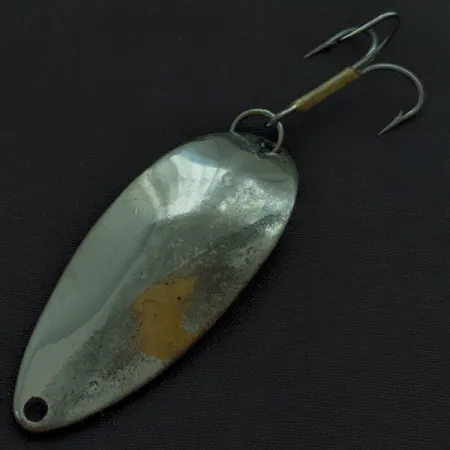 Voorzien van de iconische Hula Girl-danseres op de achterzijde, is deze vernikkelde lepel een klassiek stuk Seneca-vakmanschap. Met een gewicht van 2/3oz (18g) en een lengte van 2 1/4" (5,5cm), is dit exemplaar met productcode 22442 voorzien van de beroemde gegraveerde figuur die verzamelaars verkiezen boven moderne Acme-repro's. Het metaal vertoont lichte oppervlakkige slijtage passend bij een 4/5-conditie, waarbij de reflecterende kwaliteit behouden blijft voor zowel werpen als trollen. De constructie omvat een stevige splitring en een dreg met een kleine huls op de steel, typerend voor deze vroege in Amerika gemaakte lepels. De aanwezigheid van de danseresstempel dient als een kenmerk uit het tijdperk vóór de merkovergang in het begin van de jaren 80.