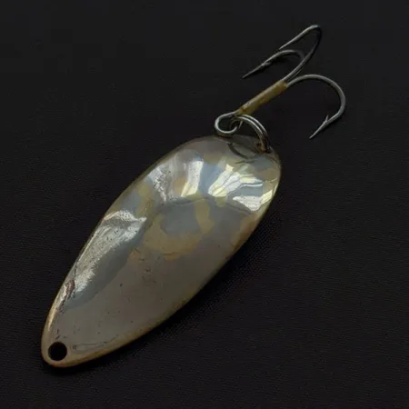 Gepolijst nikkel onthult tinten van koper en goud aan de achterzijde van deze 5,5 cm (2 1/4") lepel. Dit exemplaar, met productcode 22673, stamt uit het klassieke productietijdperk van Seneca Lure voordat het merk begin jaren 80 werd overgenomen door Acme. Gestempeld met de iconische "Hula Girl"-danseres en het "WIGL LURE"-merkteken, behoudt dit kunstaas van 18 g (2/3 oz) het karakter dat volgens ervaren sportvissers het geheim was van het legendarische succes. De afbeelding van de danseres is een gewild kenmerk voor verzamelaars, aangezien latere versies afstapten van deze gedetailleerde gravure. Met een conditiescore van 3/5 vertoont het metalen oppervlak een lichte patina door de tijd in de tacklebox, maar het beslag blijft stevig. De splitring is verbonden met een vintage dreg, die nog steeds zijn originele bronsachtige afwerking vertoont.