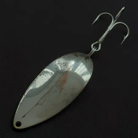Nikkel- en kopertonen domineren de afwerking van deze 6,5 cm lepel, die op de achterzijde is voorzien van de veelgezochte Hula Girl-stempel. Deze iconische afbeelding was een kenmerk van de Seneca Lure company voordat het merk in de vroege jaren 80 overging naar Acme. Verzamelaars waarderen deze versie, herkenbaar aan productcode 22714, omdat de afbeelding van de danseres uiteindelijk uit latere productieseries verdween. De zware metalen body van 21 g vertoont lichte gebruikssporen die passen bij een 4/5-conditie, waarbij het glanzende oppervlak behouden is gebleven en het licht effectief weerkaatst. Dit in de VS gemaakte kunstaas is uitgerust met een grote dreg, ontworpen voor werpen of trollen. De ingeslagen markeringen voor het gewicht en de naam Little Cleo blijven goed leesbaar tegen de metalen achtergrond.