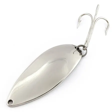 Op de hoogglans verchroomde achterzijde van deze 21 g (3/4 oz) lepel staat het iconische danser-icoon gestempeld, een kenmerk van de originele Seneca Lure Company-productie die bekendstaat als de 'Hula Girl'. Met een lengte van 6,5 cm (2 1/2 inch) vertegenwoordigt dit specifieke exemplaar het tijdperk voordat Acme het merk begin jaren 80 overnam en het kenmerkende dansmotief uiteindelijk uit de mallen verwijderde. Veel ervaren vissers beweren dat juist deze specifieke afbeelding de reputatie van de Little Cleo voor succes op het water heeft gevestigd. Het kunstaas, herkenbaar aan productcode 22881, heeft een body van zwaar metaal en een grote dreg die stevig is bevestigd met een robuuste splitring. Het oppervlak vertoont een hoogglans afwerking en de staat van dit stuk is een solide 5/5. De diepe gravure op de achterzijde toont duidelijk de naam Seneca en de herkomst uit de USA, wat het markeert als een authentiek stukje Amerikaanse hengelsportgeschiedenis.