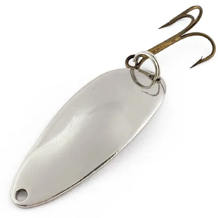 De vernikkelde afwerking van deze 4,5 cm lepel zorgt voor een opvallende schittering onder water, waardoor het een vaste waarde is in menig tacklebox. De kenmerkende 'Hula Girl' en de merknaam zijn duidelijk in het metaal gestanst, een klassiek detail uit de Seneca-productieperiode in de VS. Met een gewicht van 10g biedt dit kunstaas voldoende massa voor verre worpen of gecontroleerd trollen. Dit specifieke exemplaar, met productcode 22885, bevindt zich in staat 5/5 en behoudt een glanzend oppervlak zonder de slijtage die vaak bij vintage metalen kunstaas te zien is. Een scherpe bronzen dreg is stevig bevestigd via een robuuste splitring, klaar voor gebruik. De voorzijde is voorzien van een strak geponst bevestigingsoog, geschikt voor een directe knoop of een speldverbinding.