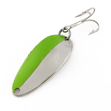 Nikkel en groene lak sieren de voorzijde van deze 4,5 cm werplepel, een kenmerkende look voor de originele productielijn van Seneca. Met een gewicht van 10 g is de achterzijde voorzien van het legendarische Hula Girl-stempel, een gravering die het tijdperk van vóór de jaren 80 definieerde, voordat het merk werd overgenomen door Acme. Veel ervaren vissers geloven dat de aanwezigheid van deze danseres het geheime succes was achter de populariteit van dit kunstaas in de Amerikaanse wateren. Dit specifieke exemplaar, geïdentificeerd met productcode 23255, is een echt overblijfsel uit de VS en verkeert in een onberispelijke staat (5/5). Het metaalwerk glanst en de gestempelde afbeeldingen zijn nog scherp, wat een tastbare verbinding biedt met de tijd waarin de Seneca Lure Company deze lepels maakte met een karakter dat in moderne versies vaak ontbreekt. De groene zijde toont een strakke, levendige kleurlaag tegen het reflecterende nikkel, ontworpen voor een hoge zichtbaarheid tijdens het binnenvissen.