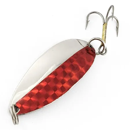 Rode prisma-tape vangt het licht op de ene helft van de vernikkelde body van deze klassieke 14g lepel. Op de achterzijde staat de iconische Hula Girl-danseres duidelijk ingestampt, een kenmerk van de originele productie door de Seneca Lure Company voordat het merk begin jaren 80 werd overgenomen door Acme. Veel ervaren vissers zweren nog steeds bij het geluk dat deze gegraveerde danseres brengt, een detail dat op moderne versies niet meer voorkomt. Met een lengte van 5,5 cm en gecatalogiseerd onder productcode 23334, is deze werplepel uitgerust met betrouwbare splitringen en een scherpe dreg. Met een conditiescore van 5/5 toont de lepel een onbeschadigde afwerking zonder zichtbare slijtage aan de nikkel- of prisma-tape, en de achterzijde is uitzonderlijk schoon gebleven.