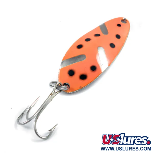 Fel fluorescerende oranje lak, geaccentueerd door opvallende zwarte stippen en diagonale nikkelen strepen, bepaalt de levendige uitstraling van deze specifieke lepel. Met een conditie-score van 5/5 toont dit exemplaar van 1/3 oz (10 g) de hoogwaardige fabrieksafwerking uit de tijd in de USA. De achterkant van het 1 3/4" (4,5 cm) lange lichaam onthult de iconische "Hula Girl" danseres-stempel, een kenmerk van de originele Seneca-productie van vóór de overname door Acme begin jaren 80. Veel verzamelaars geven specifiek de voorkeur aan deze vroege versies vanwege het silhouet van de danseres, dat ontbreekt op moderne uitgaven. Dit kunstaas, geïdentificeerd door productcode 2344, is voorzien van een gepolijste nikkelen achterkant en origineel beslag, inclusief een stevige splitring en dreg.