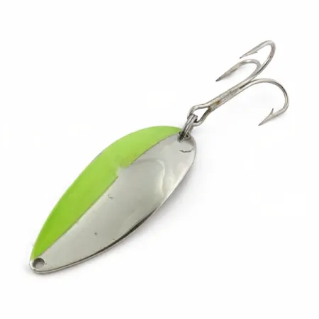 Nikkel- en groentinten bepalen de afwerking van deze 21 g (3/4 oz) lepel, een gewicht dat zorgt voor een duidelijke aanwezigheid tijdens het werpen en binnenvissen. Deze 6,5 cm (2 1/2") Little Cleo (Hula Girl) is een authentiek stukje hengelsportgeschiedenis, geproduceerd door de Seneca Lure company voordat het merk begin jaren 80 werd overgenomen door Acme. Ervaren sportvissers zoeken vaak specifiek naar deze Seneca-productie omdat deze is voorzien van de iconische ingestempelde afbeelding van de hula-danseres op de achterzijde—een detail dat bij moderne versies ontbreekt. Met productcode 23830 behoudt het kunstaas een nette, originele uitstraling met een conditiescore van 5/5. Het beslag bestaat uit een stevige dreg die is bevestigd met een robuuste splitring, typerend voor de hoogwaardige constructie die men terugziet in origineel in de VS geproduceerd Seneca-materiaal.