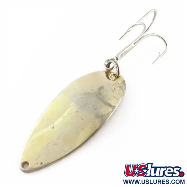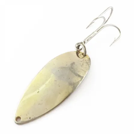 Deze klassieke lepel met een lengte van 6,5 cm is afgewerkt met een goudkleurige coating. Geproduceerd door de Seneca Lure Company vóór de overname door Acme begin jaren tachtig, is deze Little Cleo (Hula Girl) voorzien van de iconische gestempelde danseres op de achterkant. Veel ervaren vissers geloven dat dit specifieke grafische detail het geheim was achter het historische succes van dit kunstaas, een kenmerk dat in latere productieseries uiteindelijk verdween. Met productcode 24002 weegt dit exemplaar 21g en is het vervaardigd van zwaar metaal, ideaal voor zowel werpend vissen als trollen. Het exemplaar verkeert in een conditie van 4/5, met een behouden reflecterende glans op het metaal en een goed onderhouden dreg aan de onderkant.