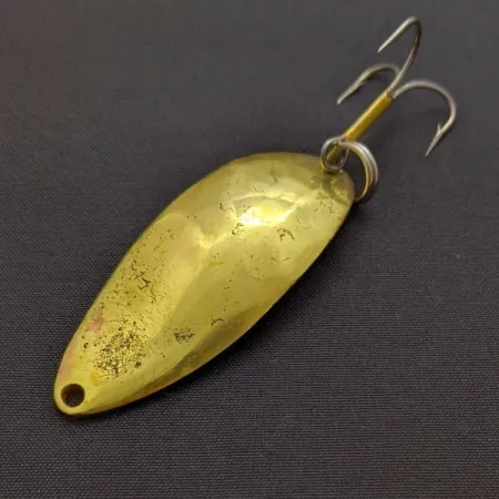 De gouden afwerking springt direct in het oog bij deze 14 g (1/2 oz) lepel, voorzien van het klassieke druppelvormige profiel dat sportvissers al decennia lang dient. Met een conditie van 3/5 vertoont het metalen oppervlak een doorleefde uitstraling met wat slijtage die getuigt van zijn geschiedenis aan de waterkant, maar de lepel blijft solide en klaar voor een verzameling of een worp. Draai de 5,5 cm (2 1/4") lange body om en je vindt de iconische "Hula Girl"-danseres in het metaal gestempeld — een kenmerk van de originele Seneca-productie voordat het merk begin jaren 80 overging naar Acme. Veel ervaren vissers zweren bij deze specifieke uitvoering, gecatalogiseerd onder productcode 24090, in de overtuiging dat de aanwezigheid van de danseres het geheim is achter de legendarische vangkracht. De montage is voorzien van een stevige dreg die is bevestigd met een robuuste splitring, wat ervoor zorgt dat het kunstaas intact blijft bij de aanval van agressieve roofvissen. Met trots gestempeld als een product uit de USA, vertegenwoordigt dit exemplaar een tijd waarin de productie van kunstaas gericht was op verfijnde details in het stempelwerk die bij moderne versies vaak ontbreken.
