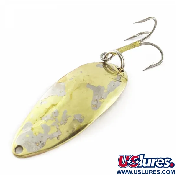 Een messing afwerking bedekt het druppelvormige profiel van deze klassieker van Seneca, een onmisbaar item voor forel- en zalmvissers uit het midden van de vorige eeuw. Met een lengte van 5,5 cm (2 1/4") en een gewicht van 14 g (1/2 oz), is dit specifieke exemplaar voorzien van productcode 24103. De achterkant van de lepel is voorzien van het gegraveerde danseres-icoon dat dit kunstaas de bijnaam "Hula Girl" opleverde, voordat Seneca begin jaren 80 werd overgenomen door Acme. Latere uitvoeringen van de Cleo lieten deze afbeelding weg, wat volgens veel ervaren vissers het geheim was achter de roem van het originele ontwerp. Zichtbare verzilvering schemert door de messing laag aan de bolle zijde, wat het metaal een authentieke, doorleefde uitstraling geeft met een staat van 3/5. Een robuuste splitring bevestigt de originele dreg aan de staart van het gestanste metalen lichaam.