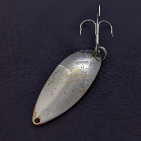 Messing- en nikkelafwerkingen vloeien samen op deze 21 g (3/4 oz) werplepel, wat een klassiek visueel profiel oplevert dat al decennia lang een vaste waarde is in menig tacklebox. Geproduceerd door de firma Seneca Lure voor hun overgang naar Acme in het begin van de jaren 80; dit specifieke exemplaar, aangeduid met productcode 24140, is voorzien van de veelgezochte 'Hula Girl' danseres gestempeld aan de holle binnenzijde. Met een lengte van 6,5 cm (2 1/2") vertoont de body sporen van zijn geschiedenis, terwijl hij een respectabele conditie van 3/5 behoudt. Op de achterzijde zijn de gravures 'Little Cleo' en 'Wiggle Lure' duidelijk zichtbaar naast de danseres, een detail waarvan veel ervaren sportvissers geloven dat het het geheim was achter het historische succes van dit kunstaas. De hardware bestaat uit een robuuste dreg bevestigd met een splitring, kenmerkend voor de duurzame Amerikaanse constructie uit die tijd. In tegenstelling tot latere massaproducties bevestigt de aanwezigheid van de danseres hier de vintage Seneca-herkomst en de verbinding met het oorspronkelijke verhaal van de lepel.