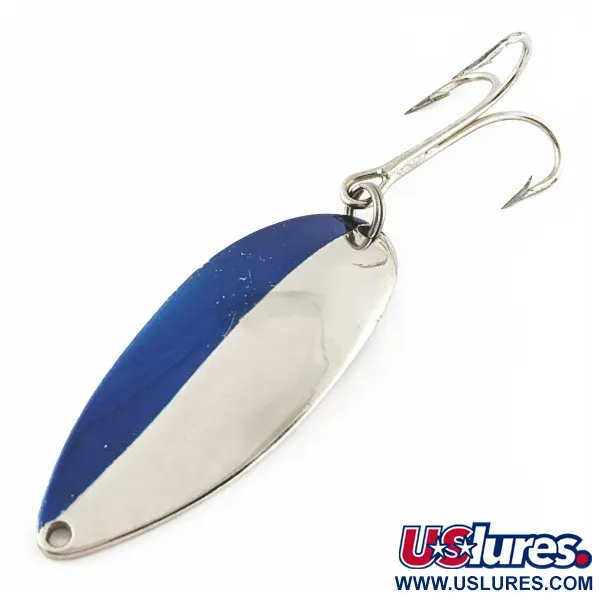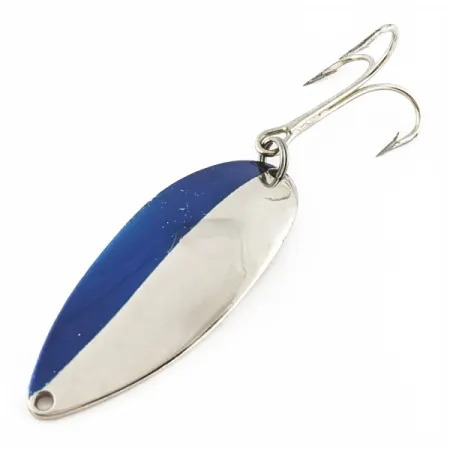 Deze lepel van 21 g (3/4 oz), voorzien van een diepblauwe streep over een gepolijste nikkelen basis, is een prachtig voorbeeld van Amerikaans hengelsportvakmanschap uit het midden van de vorige eeuw. Verzamelaars herkennen direct de kenmerkende danseres die in de achterkant is gestempeld – vaak de 'Hula Girl' genoemd – een handelsmerk van de originele productie van de Seneca Lure Company, voordat het merk begin jaren 80 overging naar Acme. Met een lengte van 6,5 cm (2 1/2") draagt dit exemplaar productcode 24174 and verkeert het in een uitzonderlijke staat (5/5), waarbij de scherpe lijnen van de gegraveerde figuur behouden zijn gebleven; veel vissers zweren dat dit het geheim was achter de roem van dit kunstaas. De zware metalen constructie en de stevige zilverkleurige dreg weerspiegelen de Amerikaanse herkomst, specifiek gebouwd voor verre worpen. Het reflecterende oppervlak is opmerkelijk helder en toont zijn ouderdom op een elegante manier met een schitterende glans op zowel de geverfde als de metalen delen.