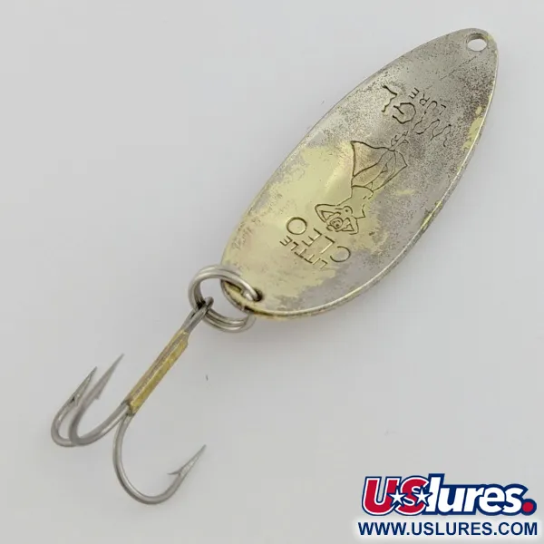 De stempel van de iconische 'Hula Girl'-figuur op de achterkant identificeert deze lepel van 14 g (1/2 oz) onmiddellijk als een klassieke Little Cleo uit het originele Seneca-tijdperk. Met een lengte van 5,5 cm (2 1/4") vertoont dit exemplaar een tweekleurige nikkel en messing afwerking die het eerlijke karakter van een doorleefde tacklebox weerspiegelt, wat het een conditiescore van 3/5 oplevert. Vóór de overname door Acme Tackle in het begin van de jaren 80 produceerde de Seneca Tackle Company uit New York deze lepels met de gedetailleerde gravure van de danseres — een toevoeging geïnspireerd op een exotische danseres die songwriter C.V. 'Charlie' Clark in de jaren 30 zag. Veel ervaren sportvissers zweren er nog steeds bij dat het logo van de danseres een geluksbrenger is voor forel en zalm in de Grote Meren. Dit specifieke kunstaas, geïdentificeerd door productcode 24443, is voorzien van klassiek zwaar beslag en een dreg die is bevestigd met een sterke splitring. Het messing basismetaal glinstert door de nikkelen plating aan de bolle kant, wat een duidelijk visueel contrast biedt dat verschilt van moderne heruitgaven.