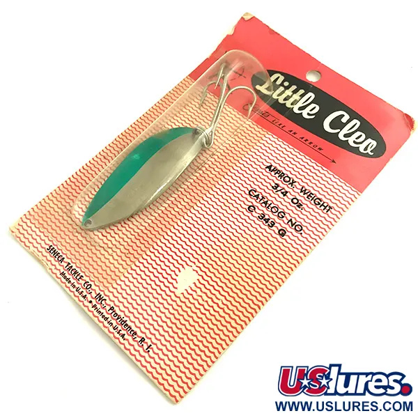 Met een gewicht van 3/4 oz (21 g) heeft deze vintage lepel de dichtheid die nodig is om tijdens het binnenvissen specifieke dieptes te bereiken. De metalen body van 6,5 cm (2 1/2") is uitgevoerd in Nikkel en Groen en heeft artikelcode 5800. Verzamelaars zullen dit herkennen als een authentiek exemplaar uit het tijdperk van de Seneca Tackle Co. uit Providence, R.I., geproduceerd voor de overname door Acme begin jaren tachtig. Het kenmerkende detail voor veel sportvissers is de iconische "Hula Girl" danseres die op de achterkant is gestanst — een detail dat later uit de moderne productie is verdwenen. Dit exemplaar is ongebruikt en zit nog in de originele rood-wit gegolfde kartonnen verpakking uit de jaren zestig, die lichte opslagslijtage vertoont.