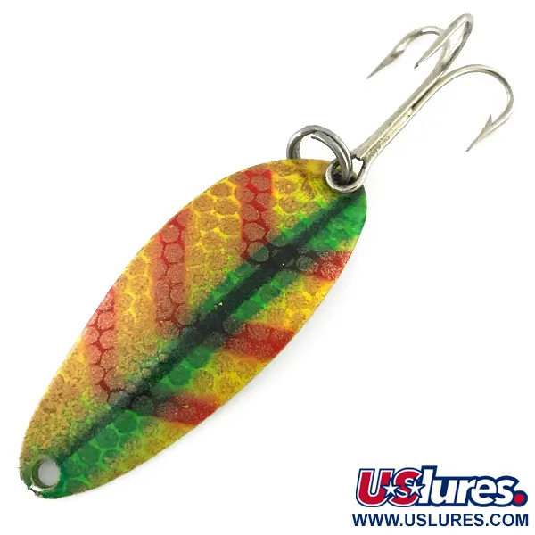Direct in de vernikkelde achterzijde gestanst is het iconische silhouet van een hula-danseres, een kenmerk dat deze vroege Seneca-productie onderscheidt van latere versies. Met een lengte van 4,5 cm en een gewicht van 10 g heeft de voorzijde van de lepel een opvallende wafelstructuur met diagonale groene en rode strepen over een gouden basis. Dit specifieke exemplaar, met productcode 8439, is voorzien van de originele stempels „Little Cleo“, „Seneca“ en „Luke“, wat de Amerikaanse oorsprong weerspiegelt van vóór de overname van het merk begin jaren 80. Het beslag blijft robuust, met een schone splitring en een glanzende zilveren dreg. Sportvissers en verzamelaars zoeken vaak naar deze „Hula Girl“-versies vanwege het historische vakmanschap en de specifieke esthetische details die later uit productie zijn genomen. Het kunstaas verkeert in uitzonderlijke, schone staat met levendige kleuren en een spiegelende achterkant, wat een 5/5 score rechtvaardigt.