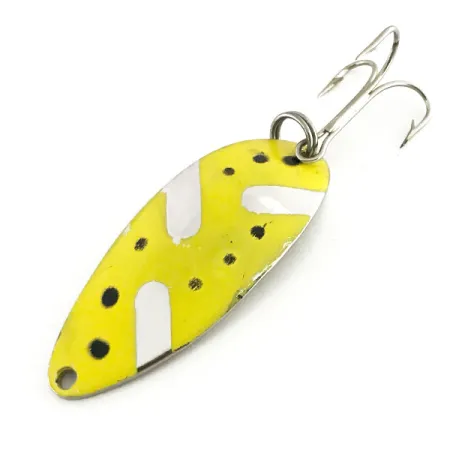 Geel emaille met zwarte stippen en gepolijste nikkelen strepen kenmerken de voorzijde van deze vintage Seneca Little Cleo (Hula Girl). Dit specifieke model, met productcode 8686, weegt 2/3oz (18g) en is 2 1/4" (5,5cm) lang. Op de achterzijde van het kunstaas is de legendarische hula-danseres in de nikkelen laag gestanst, samen met het "WIGL"-merk; een kenmerk uit het tijdperk voordat Seneca begin jaren '80 werd overgenomen door Acme. De afwerking aan de voorzijde vertoont minimale slijtage (conditie 4/5), terwijl de achterzijde zijn heldere reflecterende kwaliteit heeft behouden. Deze lepel is oorspronkelijk vervaardigd in de VS en is uitgerust met de originele splitring en een duurzame dreg voor het werpen en trollen. De gravure van de danseres is een belangrijk detail voor verzamelaars, omdat deze in latere productieseries werd weggelaten.