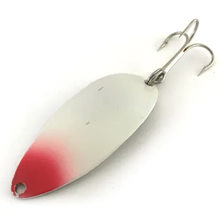 Met een gewicht van 1/2 oz (14 g) is deze authentieke Seneca Little Cleo (Hula Girl) lepel voorzien van de iconische gestempelde afbeelding van het dansende meisje op de vernikkelde achterzijde. Dit specifieke exemplaar, gecatalogiseerd onder productcode 8715, toont een parelmoer witte afwerking geaccentueerd door een opvallende rode neus aan de voorzijde. Met een lengte van 2 1/4" (5,5 cm) vertegenwoordigt het kunstaas het originele productietijdperk van het in de VS gevestigde bedrijf Seneca Lure, van vóór de overname door Acme in de vroege jaren 80. Verzamelaars jagen vaak op deze vintage versies omdat de kenmerkende Hula Girl-gravure uiteindelijk werd verwijderd in moderne uitvoeringen. De constructie bestaat uit een zware metalen body uitgerust met een stevige splitring en een zilverkleurige dreg. De oppervlakken zijn opmerkelijk schoon, wat een conditiescore van 5/5 oplevert voor de goed bewaarde lak en glanzende nikkelafwerking.