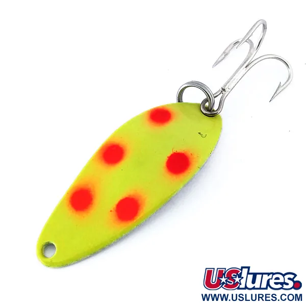 Deze vintage lepel weegt 7 g (1/4 oz) en vertoont een opvallend kleurenpatroon van vijf rode stippen op een neongeel oppervlak. Deze Little Cleo UV, met productcode 10707, werd in de VS vervaardigd door Seneca Lure voordat het merk begin jaren 80 door Acme werd overgenomen. Het metalen lichaam van 4 cm (1 1/2") is afgewerkt met een gepolijste nikkelen achterkant, terwijl de voorkant een speciale UV-reactieve coating heeft die felgroen oplicht bij weinig licht. Als een exemplaar met score 6 verkeert het kunstaas in ongebruikte staat, waarbij de originele fabrieksafwerking en hardware behouden zijn gebleven. De enkele dreg is nog scherp en zit stevig bevestigd met de originele splitring.