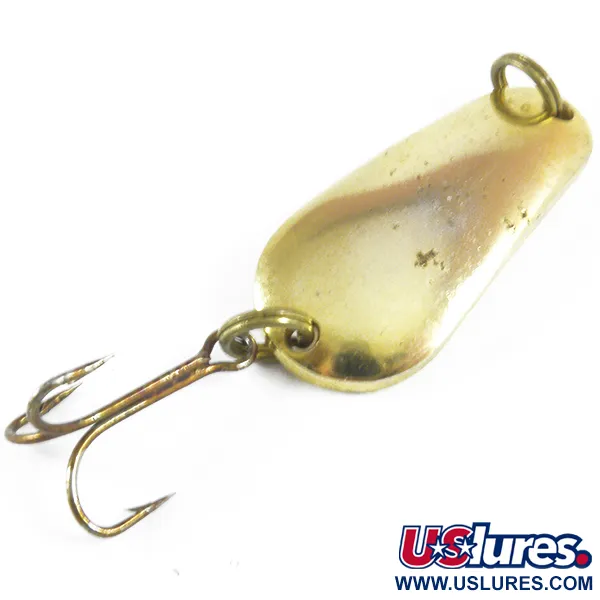 Met een lengte van precies 3,5 cm (1 1/2") is het druppelvormige profiel van deze Sensation metalen lepel gebouwd voor veelzijdige werp- of troltoepassingen. De naam "LITTLE DEMON", gestempeld in de holle zijde van het kunstaas, identificeert de herkomst als een in de VS gefabriceerd stuk visuitrusting. Een gewicht van 8 g (1/4 oz) zorgt voor nauwkeurige controle op licht tot middelzwaar materiaal. De gouden afwerking behoudt zijn reflecterende kwaliteiten en vertoont slechts kleine tekenen van slijtage aan het oppervlak die een conditiescore van 4/5 rechtvaardigen. Originele splitringen verbinden de lijnoog en de dreg, die intact blijft met wat lichte verkleuring op het metaal. Gecatalogiseerd onder productcode 3508, is dit exemplaar een zuiver voorbeeld van metaal-kunstaasontwerp uit het midden van de eeuw.