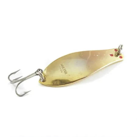 Duidelijk in de concave zijde van het metaal gestempeld staat de "DOCTOR 255" aanduiding, een kenmerkend merkteken van de Prescott Spinner company. Deze lepel met gouden afwerking weegt 1/4oz (7g) en is 1 3/4" (4,7cm) lang, voorzien van drie opvallende rode stippen bij het oog die een klassiek visueel accent geven. Het kunstaas, met productcode 2902, is uitgerust met een eenvoudige, scherpe dreg die is bevestigd met een splitring, waardoor de originele functionaliteit van deze Amerikaanse klassieker behouden blijft. De staat is een solide 4/5, met een zeer schoon oppervlak dat de kwaliteit van de vergulding benadrukt. Het vakmanschap weerspiegelt de duurzame normen die vroeger gebruikelijk waren in de productie van hengelsportartikelen in Wisconsin, waarbij het metalen lichaam zijn oorspronkelijke vorm en glans heeft behouden.