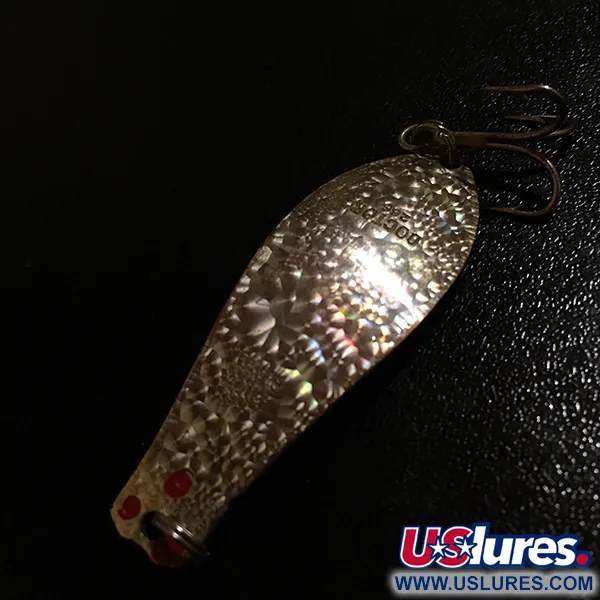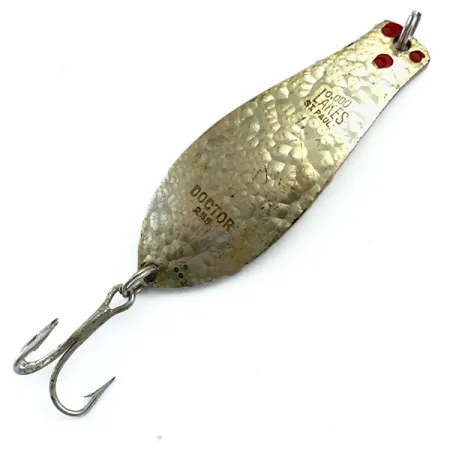 Gehamerde texturen op de achterzijde van het 1/4oz (7g) metalen lichaam contrasteren prachtig met de zeldzame gouden Crystal holografische afwerking op de voorzijde. Duidelijk in het metaal gestempeld zijn de markeringen 10,000 LAKES ST. PAUL samen met de modelaanduiding DOCTOR 255, wat de herkomst van Prescott Spinner in Minnesota, USA bevestigt. Met een lengte van 1 3/4" (4,7 cm) verkeert dit exemplaar in uitzonderlijke staat, gewaardeerd met 5/5, waarbij het reflecterende gouden oppervlak en de rode accenten scherp zijn gebleven. De constructie bevat een standaard dreg aan de basis, ontworpen voor werpen of trollen. Deze specifieke versie, geïdentificeerd door productcode 5470, valt op door de unieke lichtvangeigenschappen van de goud-kristallen getextureerde voorzijde.