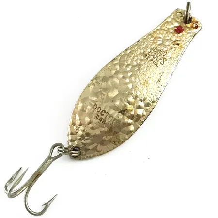 Duidelijk in het gehamerde metaal geslagen is het merkteken 'DOCTOR 255', samen met de herkomst uit St. Paul, MN. Met een gewicht van 1/4 oz (7 g) heeft de lepel een Crystal Golden afwerking met een diep gehamerde textuur, ontworpen om licht te reflecteren tijdens het binnenvissen. Het metalen lichaam meet 1 3/4" (4,7 cm) en verkeert in 5/5 conditie, met een helder en schoon oppervlak. Een opvallende rode stip bij het bovenste oog zorgt voor een kleuraccent tegen de vergulde laag. Deze kunstlure, gecatalogiseerd onder code 6168, is uitgerust met een dreg en splitringen die in uitstekende staat verkeren. Deze klassieke Amerikaanse lepel vertrouwt op zijn verzwaarde, taps toelopende ontwerp voor effectieve werp- of trolprestaties.