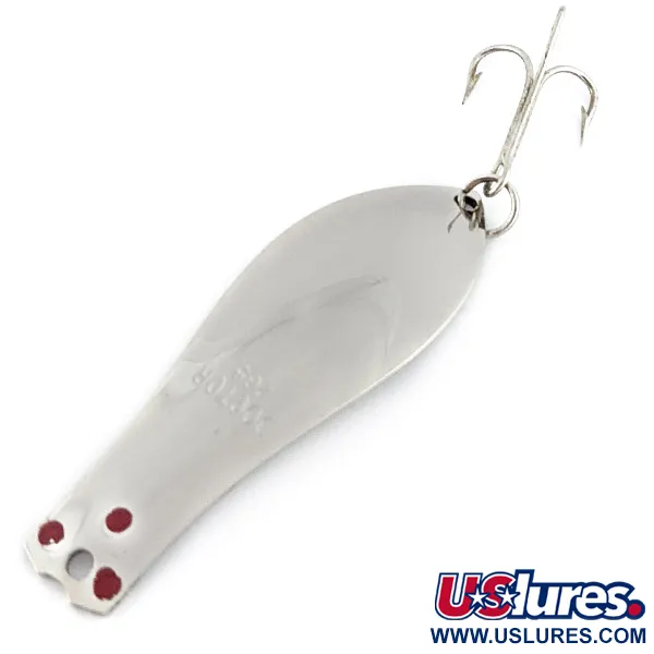 Met een gewicht van 1/3oz (10g) toont deze vernikkelde lepel van Prescott Spinner de duurzame kwaliteit van Amerikaans visgerei uit het midden van de vorige eeuw. De Little Doctor 265 heeft een lengte van 6,5 cm (2 1/2") en is voorzien van een strakke bolle voorzijde waar de modelnaam duidelijk in het metaal is gestempeld. Drie duidelijke rode stippen bevinden zich bij het oogje voor de lijn, wat een scherp visueel accent vormt tegen het reflecterende zilverkleurige lichaam. Dit exemplaar verkeert in een 5/5 conditie, met een helder, ongeschonden oppervlak dat zijn oorspronkelijke glans behoudt. Het kunstaas is uitgerust met een robuuste dreg die via een splitring is bevestigd, een configuratie die is ontworpen voor zowel werpen als trollen. Aan de achterzijde is het metaal afgewerkt in hetzelfde gladde nikkel, wat de eenvoudige maar effectieve constructie weerspiegelt van deze in de VS gevestigde fabrikant.