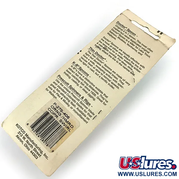 Gehamerde kopertexturen gecombineerd met een levendig oranje swirl-patroon definiëren de klassieke esthetiek van dit Prescott Spinner-exemplaar. Met een gewicht van 3/4oz (21g) is de Little Doctor 275 ontworpen voor veelzijdigheid, historisch op de markt gebracht als een "2 in 1" lepel omdat de haak aan beide uiteinden kan worden bevestigd om de presentatie te veranderen. Dit specifieke kunstaas, gecatalogiseerd onder productcode 8680, zit nog in de originele vintage blisterverpakking. De hardware is voorzien van een stevige, scherpe dreg die is ontworpen voor de zware visserij op snoek, muskie of meerforel. Terwijl de gehamerde kant zorgt voor reflecterende flitsen, is de contrastrijke swirl-kant bedoeld voor zichtbaarheid tijdens het trollen, werpen of diep jiggen. Omdat het nooit van de door KOTCO Manufacturing geproduceerde achterkaart is gehaald, is het kunstaas ongebruikt. De verpakking biedt technische instructies voor verschillende dieptes, waarbij wordt geadviseerd de lijn aan de brede kant te bevestigen voor een wijdere actie of aan de smalle kant voor diepwatertoepassingen.