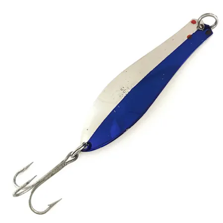 Een gewicht van 21 g geeft de Prescott Spinner Little Doctor 275 de nodige massa voor werpen of trollen. De voorzijde van de lepel heeft een strakke Nickel / Blue split-afwerking, geaccentueerd door een klein rood geschilderd oogdetail bij de bevestigingsring. In het metalen lichaam is de code 9106 duidelijk gestanst, wat dient als een betrouwbaar kenmerk voor dit vintage in de VS gemaakte kunstaas. Met een lengte van 9 cm behoudt het kunstaas een slank profiel met een volledig vernikkelde achterzijde die het licht door de waterkolom reflecteert. Dit exemplaar verkeert in 5/5 conditie en toont opvallend schone oppervlakken op zowel het metalen lichaam als de originele dreg.