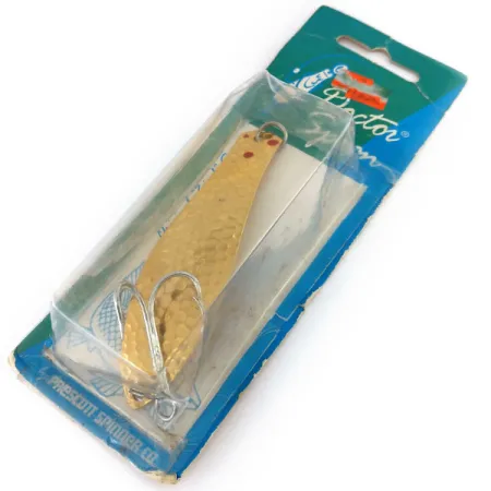 Een gehamerde goudlaag bedekt het volledige oppervlak van deze 9 cm (3 1/2") lepel, geaccentueerd door duidelijke rode stippen bij het bovenste oogje. Met een gewicht van 21 g (3/4 oz) is de Little Doctor 275 een klassiek, veelzijdig ontwerp van de Prescott Spinner Co., die later deel uitmaakte van de KOTCO Manufacturing-lijn uit Akron, Ohio. Dit specifieke exemplaar, met productcode 9748, zit nog in de originele vintage blisterverpakking. Het kunstaas zelf is ongebruikt en toont de heldere, reflecterende kwaliteit van de gehamerde metalen afwerking. De "Doctor"-serie staat bekend om zijn veelzijdigheid aan beide uiteinden; hoewel hier uitgerust met een zware zilverkleurige dreg aan de brede kant, kan de lijn aan beide zijden worden bevestigd om de diepte en weerstand te veranderen tijdens het trollen of werpen. De achterkant van de verpakking bevestigt de geschiktheid voor grotere roofvissen zoals snoek, musky en glasbaars.